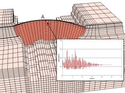 Vieux-Emosson dam, Switzerland. 3D mesh and displacement at crown during an earthquake. Client: SBB-CFF, 2006-2007